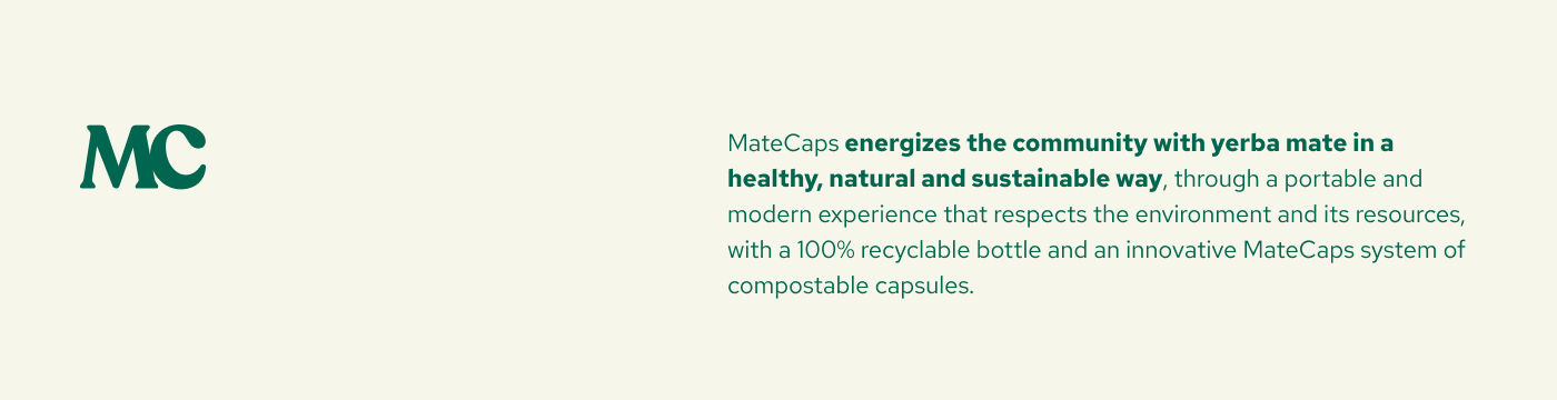 MateCaps energizes the community with yerba mate in a healthy, natural and sustainable way, through a portable and modern experience that respects the environment and its resources, with a 100% recyclable bottle and an innovative MateCaps system of compostable capsules.